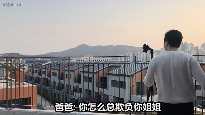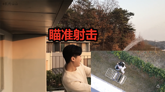 山山因看到姊姊正在下方晾衣服,他便叫爸爸幫他拿攝影機,一起到了樓上陽台外,山山開始架設一台對準姊姊的攝影機,準備就緒後就開始拿起灑水器準備往下灑水,爸爸在一旁不停的說:「你怎麼總欺負你姐」、「別總欺負她呀」,但仍然無法阻止山山惡整姊姊。
