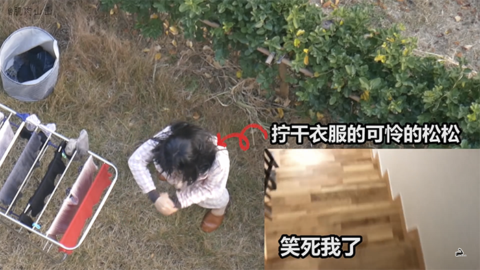 山山開始往下灑水時,松松一開始還以為是下雨了,沒有發現是惡作劇,接下來山山使用臉盆裝了一大盆水,瞄準松松後往下潑,過程中爸爸也不斷的勸阻要他別潑水了、萬一姊姊感冒怎麼辦,但山山完全不理會爸爸。松松也被那一大盆水淋得全身濕,暴怒的對弟弟說:「不想活了吧!」,並追上樓梯作勢要打他,並向他大力的丟衣服,可見姊姊非常的生氣。