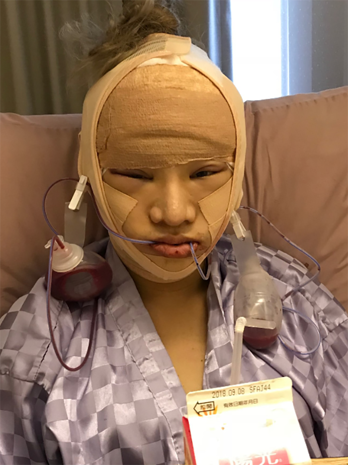 小A辣自九月動手術之後,距離現在已經三個半月,看得出她復原相當好!事實上小A辣在此番的整形之中,總共動了提眉、降髮際、豐額、磨眉骨,切除下顎骨等等手術。為了不留下疤痕,小A辣表示這次臉部的削骨手術是從嘴巴中下手,只見照片中小A辣整個額頭及臉部都被紗布包裹,另有管子深入口中,模樣相當駭人。而因為降髮際、豐額的緣故,小A辣額頭也有明顯的傷口,現在需要貼人工皮,讓傷口復原。
