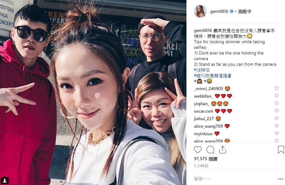 香港歌手鄧紫棋以超廣音域贏得鐵肺歌后的稱號,更在幾年間迅速紅遍兩岸三地,今年適逢鄧紫棋出道10周年,他除了陸續推出紀念專輯,也不斷傳出享譽國際的捷報。愛情事業兩得意的她,今年開始放閃和造型師男友的同框合照,22日,鄧紫棋和友人合照,更充當人體自拍棒並自誇是「顏質擔當」,雖然立即被造型師男友在底下吐槽,不過網友卻認為兩人再次甜蜜放閃。
