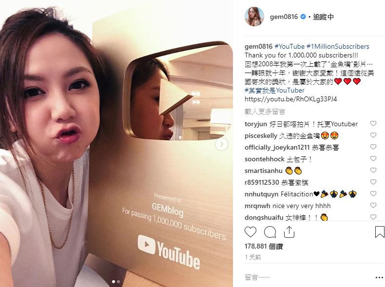 近期鄧紫棋的名聲已經揚名國際,5日,不僅成為NASA突破獎首位頒獎女華人,更在典禮現場演唱自己的經典歌曲《光年之外》,19日甚至奪得「BBC百大女性」第34名,對此,當時鄧紫棋也發文表示受寵若驚並說到「11月是我的幸運月」,21日又再曬出來自YouTube「百萬訂閱數」的獎狀,意外讓鄧紫棋擁有了另一個特殊身分。