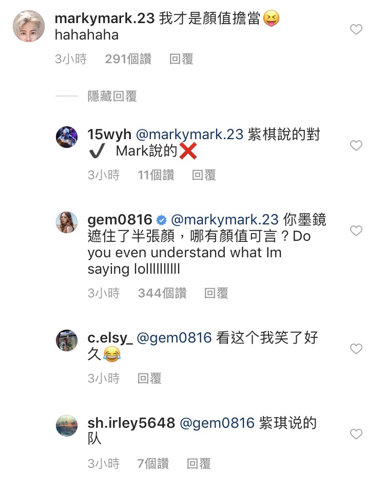 不過,鄧紫棋隨即在貼文底下補充說明「沒辦法誰叫我是顏值擔當」,對此,男友Mark卻立即在留言處打臉女友並爭著說「我才是顏質擔當」並貼上吐舌頭的表情符號相當淘氣,然而鄧紫棋卻回應「你墨鏡遮住了半張顏,哪有顏值可言」兩人不停回嘴被粉絲認為相當有趣並表示「看這個笑了好久」、「閃閃閃姐姐」、「紫棋現在越來越皮」。