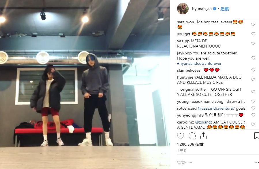 素有韓國性感小野馬之稱的歌手泫雅,過去單人闖蕩演藝圈的她,去年在公司安排下和師弟組成企劃團體Triple H,8月3日,泫雅對外承認和同門師弟E'dawn金曉鐘的戀情,起初重創演藝事業再陸續退出Cube後,兩人終於開始公開放閃。22日,泫雅和E'dawn練舞畫面曝光,時隔兩個多月再次看到共舞畫面,如今身分已經不同,在外界看來十分甜蜜。