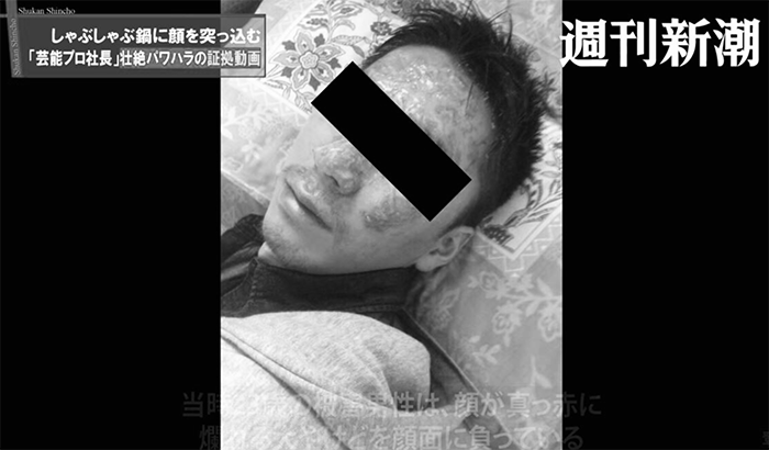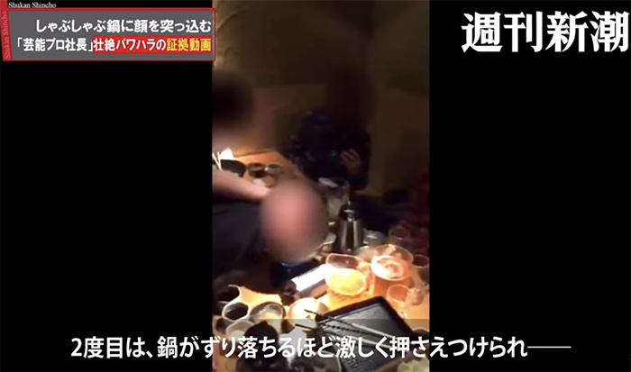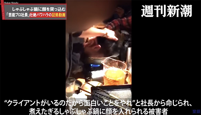 根據日媒《產經新聞》報導,該受害男員工的委任律師說明:男員工於2014年進到此間娛樂公司上班,同年底尾牙上因為喝到宿醉,導致隔天上班遲到,被社長處罰「剃光頭」、「罰10萬日幣」後續接連慘遭職場霸凌,像是「跪著工作」、「狂毆至吐血」等殘忍舉動。然而,他在隔年的尾牙中,遭社長要求「幹點好笑的事情」,儘管他表示「做不到」,還是被抓頭髮、被壓臉進滾燙的火鍋中!尾牙結束後,社長僅說:「臉看起來真糟,還是回家好了」,完全沒有得到一句道歉。