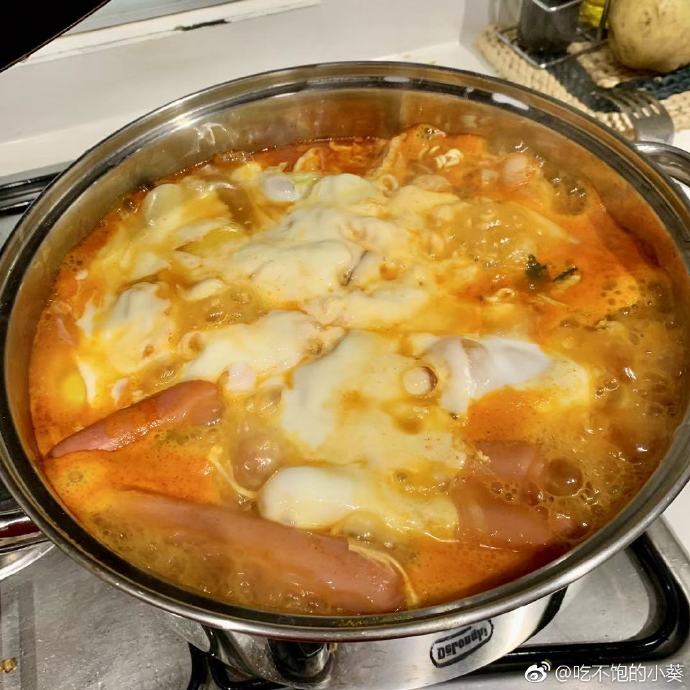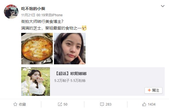 21日凌晨,歐陽娜娜在另一個私人微博中分享消夜文,並配文說到「街拍大師轉行美食博主」。文中歐陽娜娜透露起司是她最愛的食物之一,照片中,一個非常大碗的韓式部隊鍋裡除了紅通通的湯底外,裡面還放了泡麵,甚至在上頭撒滿金黃色起司,光是用看的就是視覺饗宴。