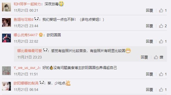 該則博文另一張照片,是歐陽娜娜的臉部特寫照,由於鏡頭太近整張臉幾乎占滿畫面,完全卸下偶像明星的包袱。對此,大批網友竟開始呼籲歐陽娜娜減肥,並紛紛表示「難怪越來越圓了」、「卡路里是你的天敵」,另有網友想起日前歐陽娜娜曾透露想練腹肌並說到「答應我馬甲線訓練不要停好嗎」。