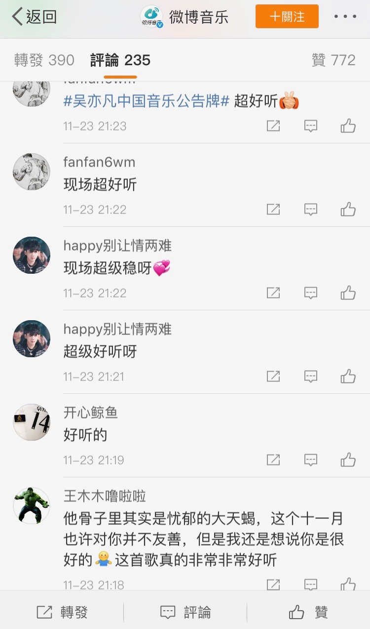 此外,吳亦凡也借粉絲的話表示「聽吳亦凡的歌要現場聽才行」,在節目花絮中,就可以看到吳亦凡為充分演繹歌曲《November Rain》的孤獨感,他不僅捨去原先安排的舞者,也兼任音樂導演親自設計演出。當晚演唱結束後,網友認為該首歌曲充分反映出吳亦凡備受外界質疑的孤獨感,並紛紛表示「歌很好聽,讓人充分感受到一個孤獨男孩的心聲」、「不是多傷感的歌但是聽他唱就想哭」。