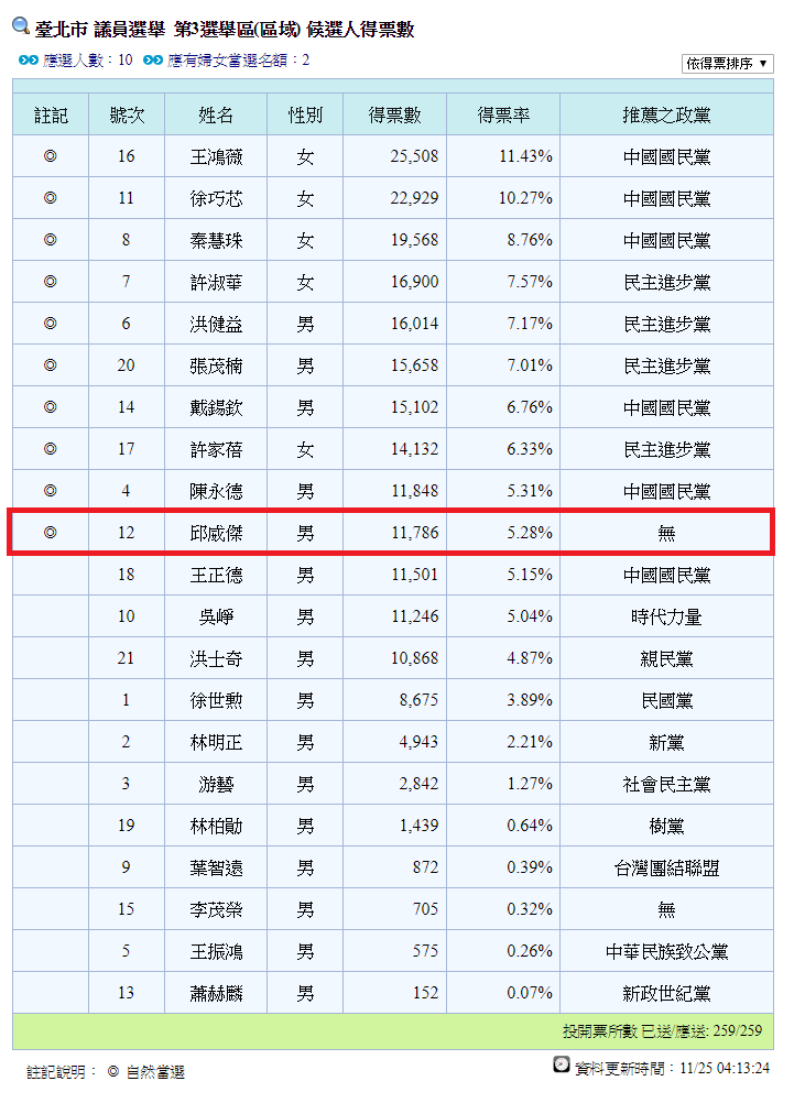不僅如此,呱吉更是前十名候選人中,唯一一位無黨籍候選人,而呱吉也已經在21:37於臉書發文打上:「謝謝,各位,和老婆看電影,生活要正常過,工作認真做」,搶在開票結果之前感動謝票,貼文一發便在短時間便湧入上千則留言,紛紛恭喜他,更有許多粉絲打上:「邱議員好」、「期待議員開箱」,更有粉絲搞笑直說:「有改名有差」。