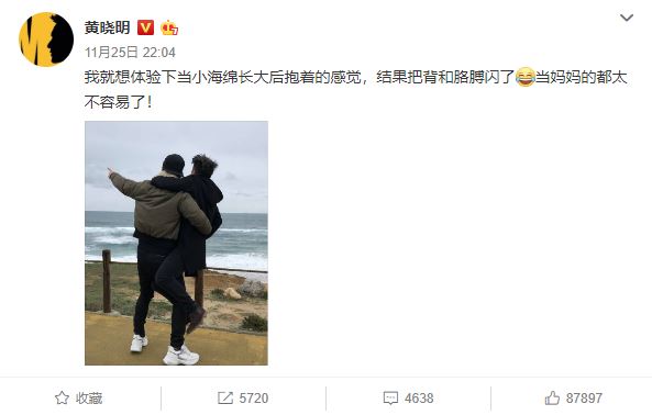 而25日,老公黃曉明也在微博模仿Angelababy曬出單手抱兒照,沒想到黃曉明竟閃到背和手臂,並直呼「當媽媽的都太不容易了」。不過照片中的小海綿已經大到更黃曉明身高齊平了,事實上,黃曉明因為想體驗「小海綿長大後抱著的感覺」,所以找來朋友讓他實驗,雖然成功單手抱起,不過卻弄傷身體,畫面曝光十分逗趣,引發網友熱烈討論,並說到「注意你的腰啊」、「這麼大的小海綿確實有點難」,但也有網友表示「明哥應該抱著baby拍一個好不好」。