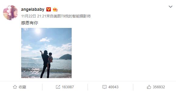 Angelababy時常公開分享和小海綿的互動生活照,不過因為保護小孩始終未能看到小海綿的正臉照,22日適逢感恩節,Angelabay曬出單手抱小海綿的照片,並配文說到「感恩有你」。照片中,Angelababy一手抱住小海綿,另一手則指向遠方美麗海景,似乎示意小海綿趕緊抬頭看海,對此,網友紛紛表示「小海綿明年一月滿2歲,個子比同年齡高許多」、「小海綿長得好快,還有點高 還有多長時間,你就抱不動了」。