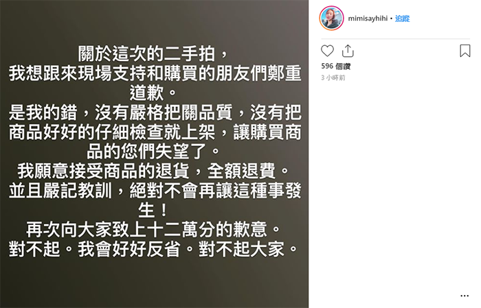 而26日張瀅也出面真對此事鄭重道歉:「是我的錯,沒有嚴格把關品質,沒有把商品好好的仔細檢查就上架,讓購買商品的您們失望了」,她表示自己願意接受商品退貨,並且全額退費,「嚴記教訓,絕對不會再讓這種事發生」。