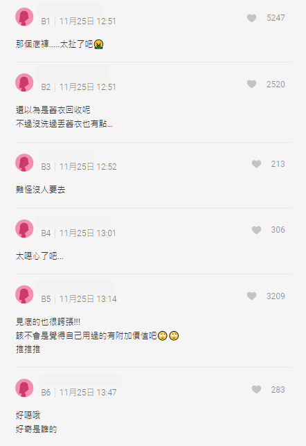 不僅如此,最讓原PO崩潰的還是一件黑色的連身泳衣,這件泳衣標價500元,上頭卻明顯沾有已經乾掉的分泌物,發黃的模樣令人作嘔!照片上傳之後,便引起網友高度討論,「那個底褲.....太扯了吧」、「還以為是舊衣回收呢,不過沒洗過丟舊衣也有點」、「太噁心了吧...」、「該不會是覺得自己用過的有附加價值吧」,砲轟的留言不斷!