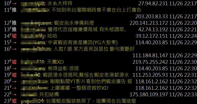 對此,外界似乎對於蝦皮砸錢邀請BLACK PINK代言商城不太買單,而在論壇PTT中也引起不少爭議。網友普遍將問題指向團體所屬經紀公司YG娛樂,認為公司屢次替團體買榜賺人氣,並說到「所以蝦皮要推出買榜功能嗎」、「中資蝦皮背後是騰訊(YG是大股東)」,甚至有網友針對過去演出偷懶放水直言到「花大錢請他們去划水」、「蝦皮泡水準備料理」,對於蝦皮找該團代言活動惡言評價。