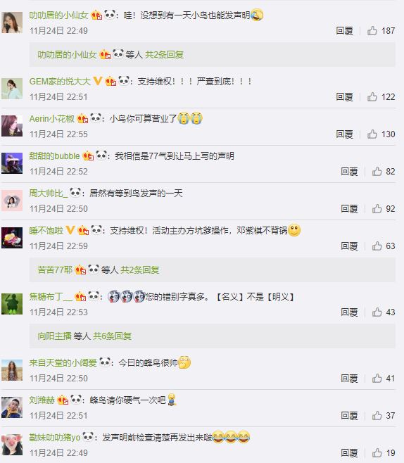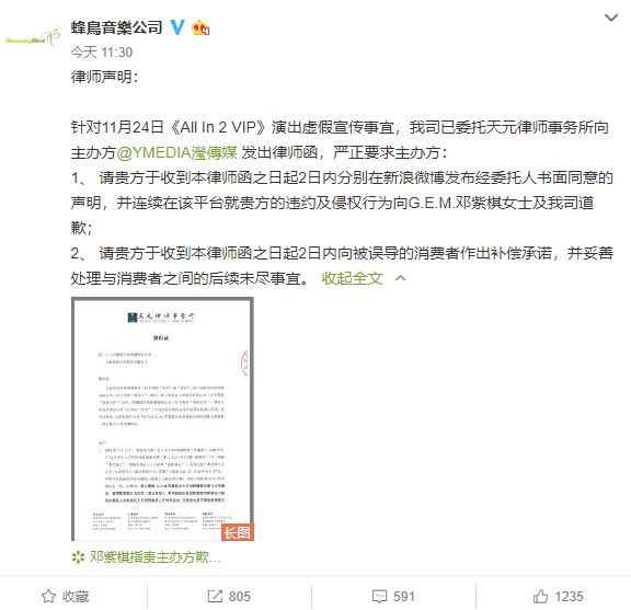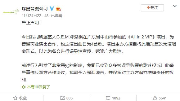 對此,鄧紫棋經紀公司蜂鳥娛樂事後也發表聲明,表示公司針對此事擬對主辦方追究法律責任,然而漏洞百出的聲明稿讓粉絲更加不滿。針對公司聲明,粉絲指出兩點不滿包括沒有公司印章、手打聲明稿中錯字百出,並紛紛表示「居然等到鳥發聲的一天」、「發聲明前檢查清楚再發吧」、「公司終於有點用了」,在粉絲的催促下,事隔三ㄊㄧㄢ27日,公司終於發表「正式聲明稿」尋求法律協助。