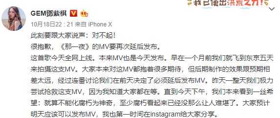 鄧紫棋工作狀況頻傳過去也曾發生,鄧紫棋9日推出的新歌《那一夜》MV由鄧紫棋首次擔綱編導演三角,事實上MV早在上月18日就要推出,卻受到後期製作影響未能如期上線,新歌出狀況,鄧紫棋第一時間在網路發出道歉啟事,甚至包下了所有工作及時搶救,讓粉絲心疼。