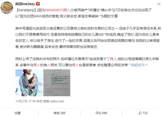 27日,韓國論壇盛傳一篇文章名為「因為女團MAMAMOO成員的爸爸,我父親去世,家庭支離破碎」。文中解釋,輝人和受害著父親雙方是商業夥伴,受害者父親原先不願意「費用後付」,不過輝人父親不斷強調「自己的女兒是MAMAMOO成員」,因而選擇相信輝人父親。