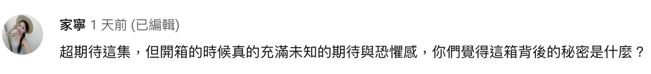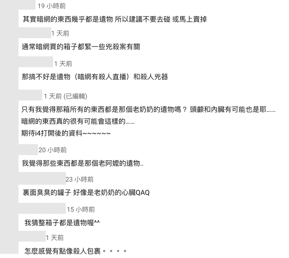 看完來自暗網的包裹開箱,家寧也在下面留言:「超期待這集,但開箱的時候真的充滿未知的期待與恐懼感,你們覺得這箱背後的秘密是什麼?」,網友們也紛紛猜測這包裹是不是某個人的遺物,留言表示:「通常暗網買的箱子都緊一些兇殺案有關」、「其實暗網的東西幾乎都是遺物 所以建議不要去碰 或馬上賣掉」、「裏面臭臭的罐子 好像是老奶奶的心臟QAQ」、「我猜整箱子都是遺物喔^^」、「怎麽感覺有點像殺人包裹…」、「只有我覺得那箱所有的東西都是那個老奶奶的遺物嗎? 頭顱和內臟有可能也是耶……」、「那搞不好是遺物(暗網有殺人直播)和殺人兇器」、「我覺得那些東西都是那個老阿嬤的遺物..」