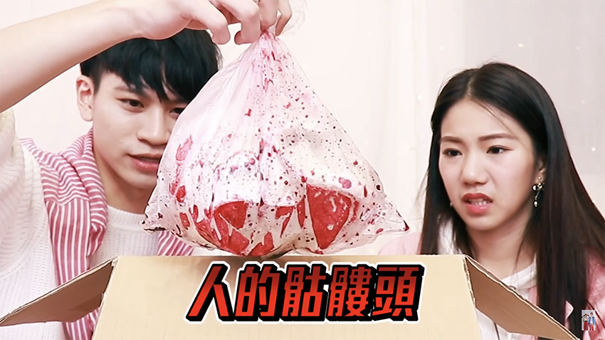 打開包裹第一個看到的是一個小盒子,上方貼著一張寫著「A Little Gift Good luck xoxo」的紙條,裡面裝有神似香香包的香氛類物品,接著他們從包裹內拿出毛帽、手錶、打火機、Iphone 4,以及放著各國鈔票,以及一張老奶奶照片的LV錢包,也讓Andy猜測這些會不會是「某個人的遺物之類的」。其中有一個小盒子上畫了一個愛心,但是打開後裡面是一個玻璃罐,裝著一小塊器官,周圍佈滿鮮血,Andy打開罐子聞味道,那味道讓他乾嘔並直呼:「好臭哦!」,最後他們拿出一個塑膠袋裝著一個頭顱,袋子內也充滿鮮血,在打開袋子前他們也誠心的拜拜,一打開袋子就飄出肉爛掉的味道,Andy更表示:「這我一生中沒有聞過的味道」