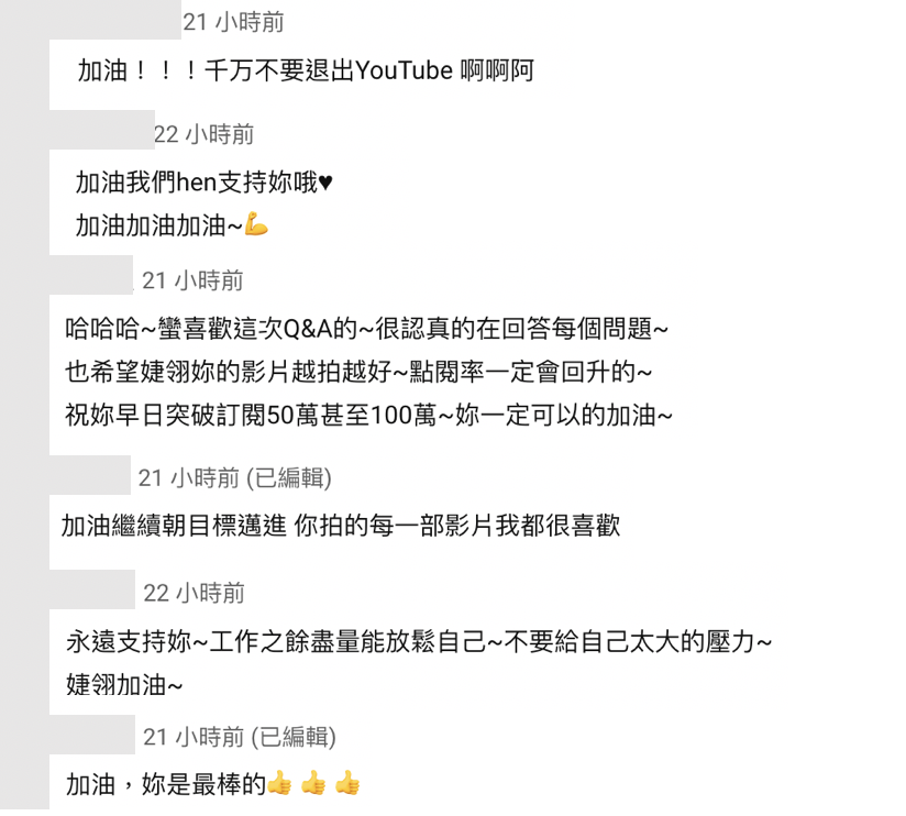 看完影片的網友也紛紛為婕翎加油:「加油!!!千萬不要退出YouTube啊啊啊」、「加油我們hen支持妳哦 加油加油加油」、「永遠支持妳~工作之餘盡量能放鬆自己~不要給自己太大的壓力~ 婕翎加油~」、「加油繼續朝目標邁進 你拍的每一部影片我都很喜歡」、「哈哈哈~蠻喜歡這次Q&A的~很認真的在回答每個問題~ 也希望婕翎妳的影片越拍越好~點閱率一定會回升的~ 祝妳早日突破訂閱50萬甚至100萬~妳一定可以的加油~」、「加油,妳是最棒的」