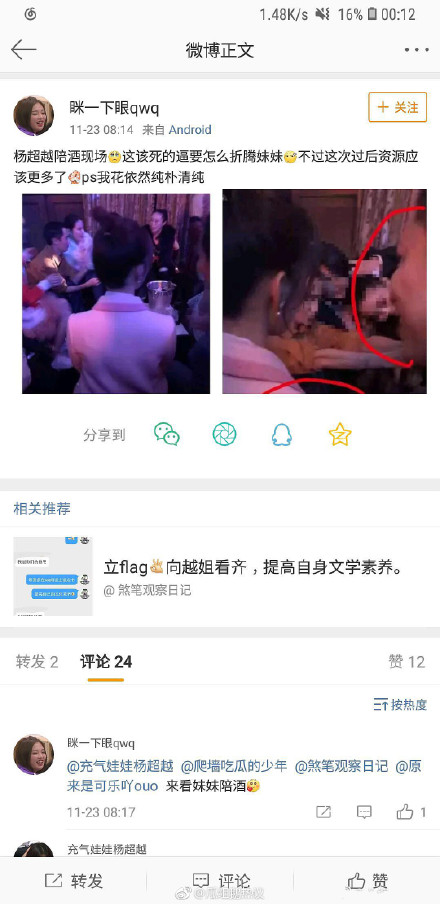 近期,吳宣儀粉絲在網路上瘋傳一張楊超越坐在男性友人旁的照片,並造謠楊超越陪酒。照片中,楊超越在一個燈光昏暗的場合裡,身旁就坐著一位男性友人,兩人肩膀緊貼狀似親密,吳宣儀粉絲便開始辯稱「楊超越陪酒女石錘」,甚至眼紅楊超越的演藝事業並諷刺「從這之後資源應該更好了」。