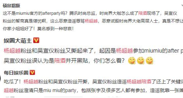 對此,楊超越粉絲立即出面闢謠,指證吳宣儀粉絲捏造不實謠言,並解釋22日楊超越前往上海參與服裝品牌miu miu「2019早春時尚秀」的派對,當晚有多組藝人共襄盛舉,這張被誤解的照片,就是當晚結束活動後,騰訊高層帶著楊超越和品牌前輩參與應酬的場合,同時指責吳宣儀粉絲的惡行,已經有辱時尚界前輩和楊超越本人。