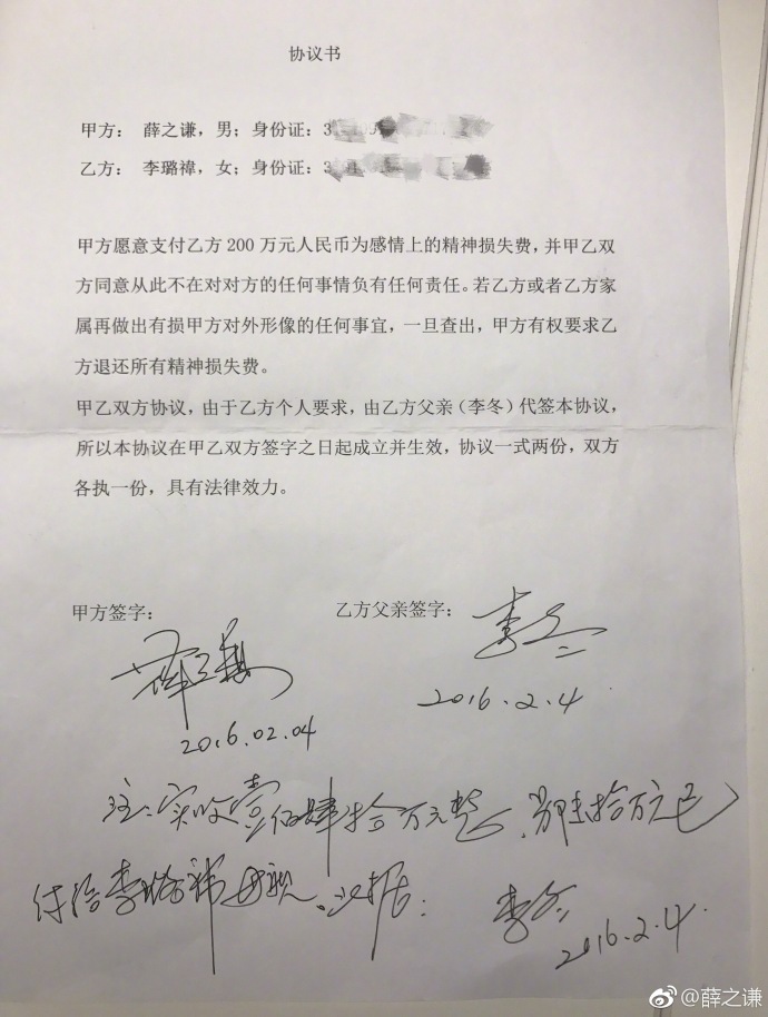 此外,薛之謙也將去年9月21日,對前女友李雨桐「騙財逼墮胎」的惡意指控再次置頂微博版面,長文中也直言「若有半句虛言半張假圖我願意入獄承擔一切法律後果」。薛之謙的證據將分手後續處理過程全都搬上檯面,針對墮胎謠言,薛之謙表示兩人分手後得知李雨桐懷孕,雙方達成協議拿掉孩子也協議200萬人民幣精神賠償,而針對騙錢一事,薛之謙拿出契約,契約中顯示薛之謙願意支付精神賠償,並且明指前女友若有任何造謠行為,薛之謙甚至可以要求拿回所有賠償費,正式打破李雨桐1年多來的不實指控。