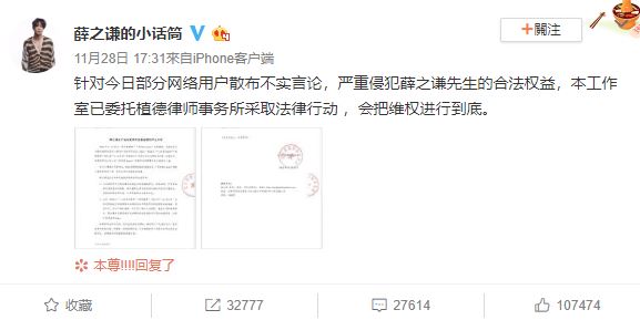 28日,薛之謙在個人微博以長文直指李雨桐和外界誤傳的謠言包括騙錢、逼墮胎和老婆患罕病,並透過工作室貼出法律聲明,準備提告李雨桐和指名造謠的微博帳號。文中,薛之謙透露隱忍1年多的原因在於對方是女生且念在舊情,接著明確指出李雨桐罪名並說到27日「用化名用縮寫夜裡發白天刪除簡直不可理喻」,薛之謙於文中直言「這麼低級的汙衊,為了自己的熱度隨意傷害別人,還有無良大號跟風無腦傳播。」讓他在文中強硬表示「今日我不再承諾唯法律途徑一條請你準備好應訴吧,我已經給了機會整整14個月」。
