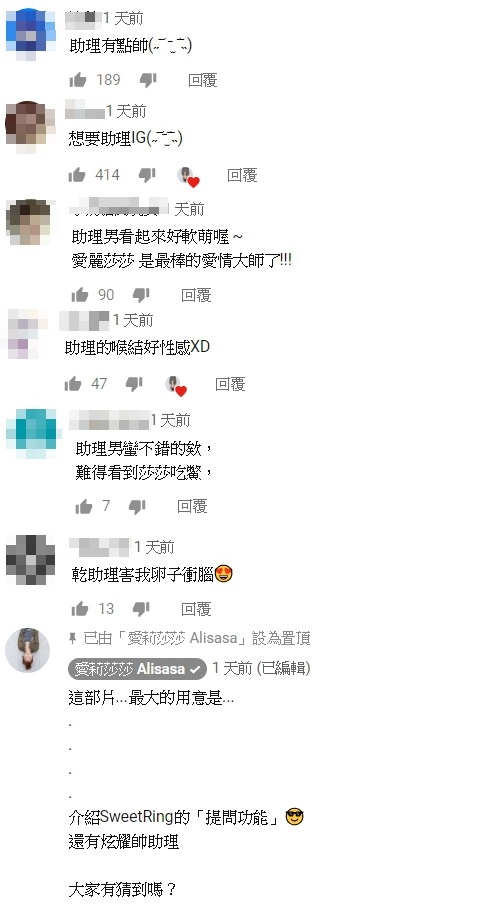 完成五項問答後,愛莉莎莎也以五分之四的答對成績,順利守住戀愛大師的封號,不過此次更令網友關心的是,第一次曝光的新助理,網友們紛紛留言:「助理有點帥(˶‾᷄⁻̫‾᷅˵)」、「想要助理IG(˶‾᷄⁻̫‾᷅˵)」、「助理男看起來好軟萌喔~愛莉莎莎 是最棒的愛情大師了!!!」、「助理男看起來好軟萌喔~愛麗莎莎 是最棒的愛情大師!!!」、「助理的喉結好性感XD」、「助理男蠻不錯的欸,難得看到愛莉莎莎吃鱉」、「乾助理害我卵子衝腦」。