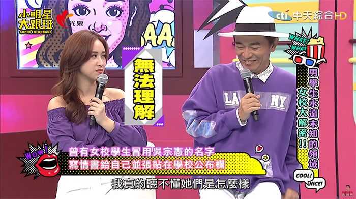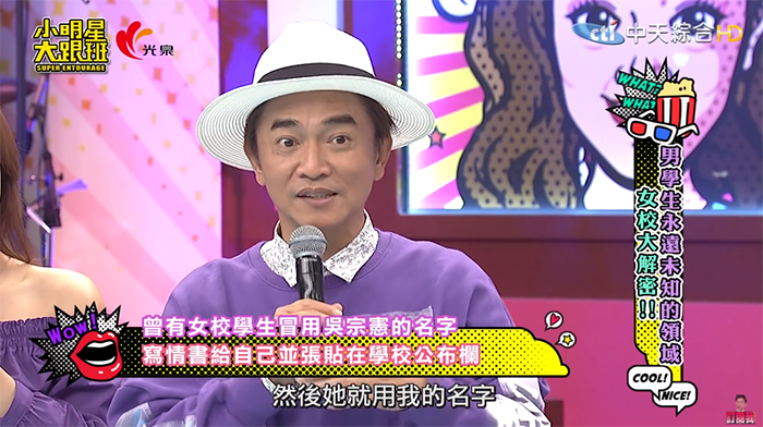 但當時吳宗憲正和那所女校的另一個女生在交往,也知道寫信的女生對自己有意思,雖然沒有再繼續追究,但他也推測,有可能是想藉此破壞兩人感情,甚至是用來自抬身價。不過平時就愛吐槽他的Sandy,在一旁毫不留情的說:「我真的聽不懂她們是想怎樣,為什麼要喜歡你?」吳宗憲直說:「你們誰高中就開演唱會的?!而且還是高一!」也難怪他在學校會這麼受歡迎。