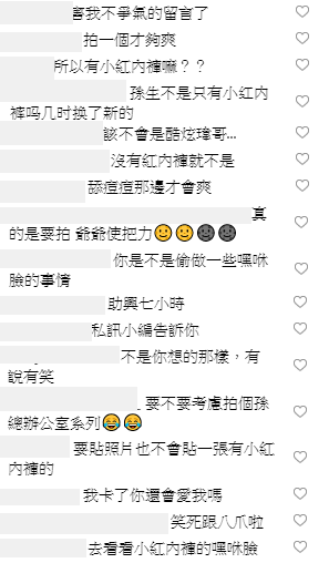 之後便有許多網友留言:「要貼照片也不會貼一張有小紅內褲的」、「去看看小紅內褲的嘿咻臉」、「人紅是非多 很棒麻~」、「助興七小時」、「沒有紅內褲就不是」、「所以有小紅內褲嘛??」、「助興7小時,說到做到」、「不是你想的那樣,有說有笑」,因為孫生過去喜歡穿著小紅內褲而讓人印象深刻。