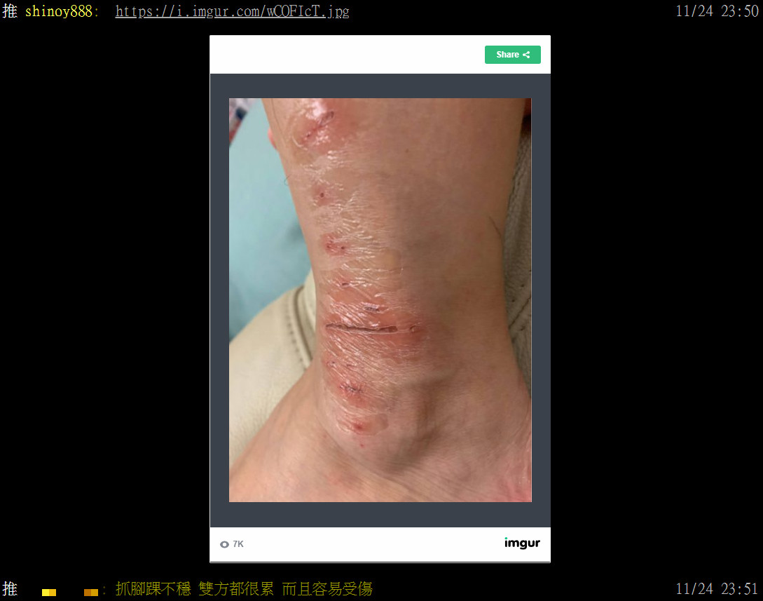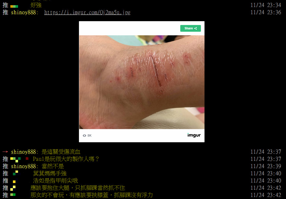 隨後他也在PTT中爆出「泥巴田」競賽不為人知的內幕,他表示自己在過程中被抓傷,只見他手腕上有長長一道抓痕,腳踝也留下許多傷,受傷後全靠意志力苦撐,儘管最後還是輸了,但Paul拚命的運動家精神超勵志,讓許多網友們看了直呼感動。