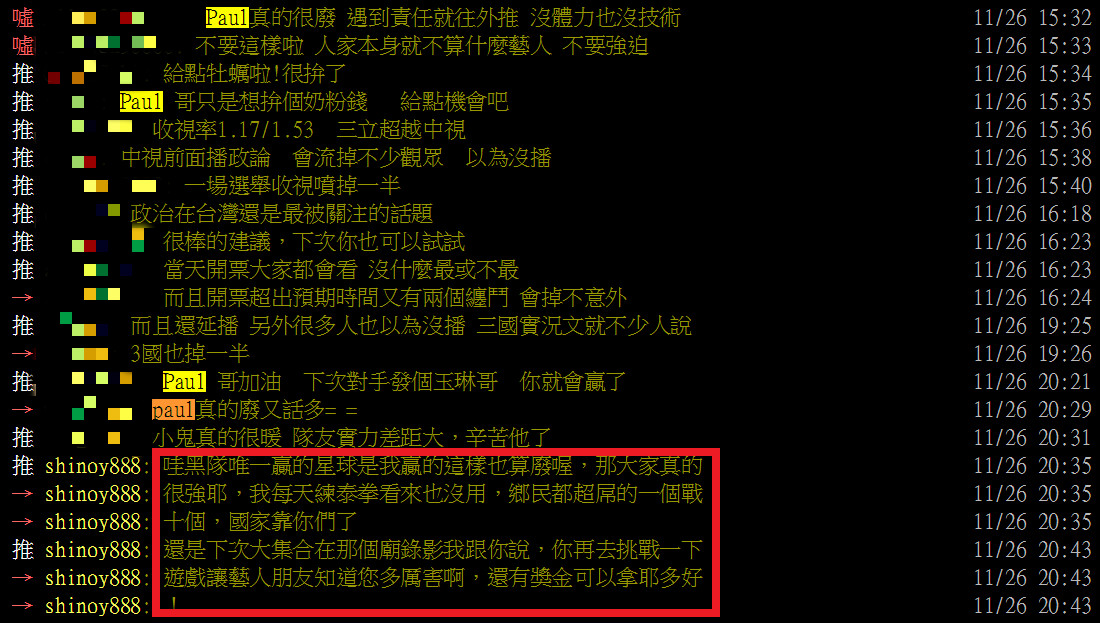 不過仍有網友酸他很廢、對黑隊沒有貢獻,「遇到責任就往外推 沒體力也沒技術」。Paul看了不服氣,霸氣回嗆:「哇黑隊唯一贏的星球是我贏的這樣也算廢喔,那大家真的很強耶!我每天練泰拳看來也沒用,鄉民都超屌的一個戰十個,國家靠你們了!」
