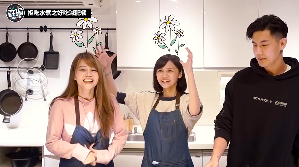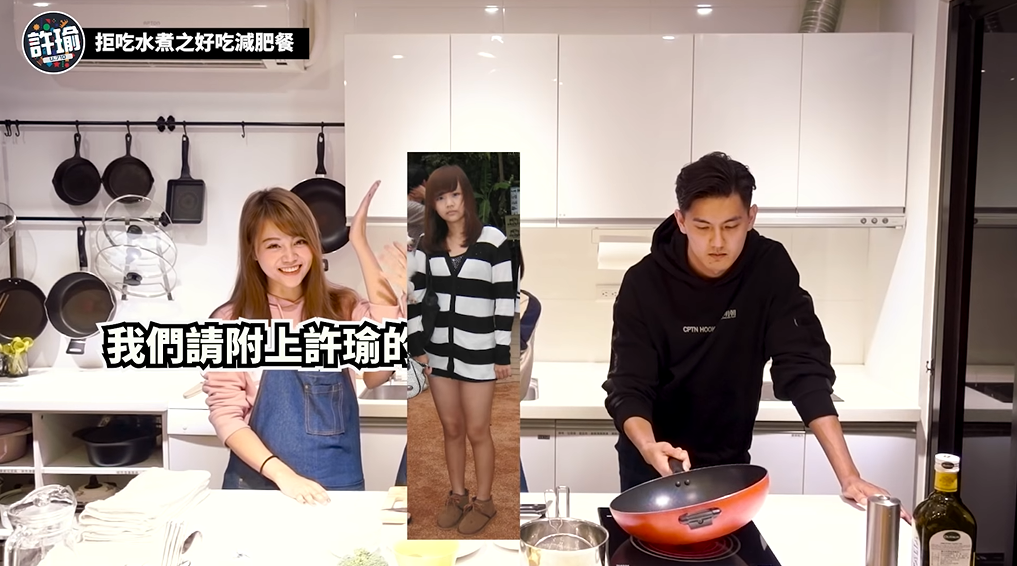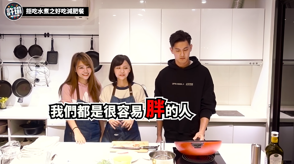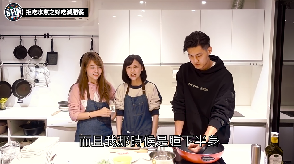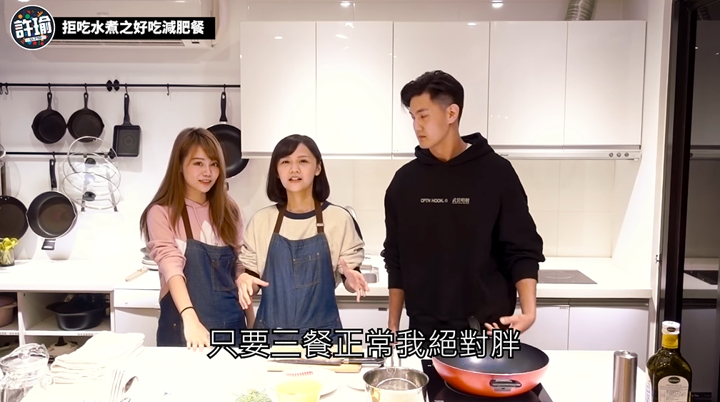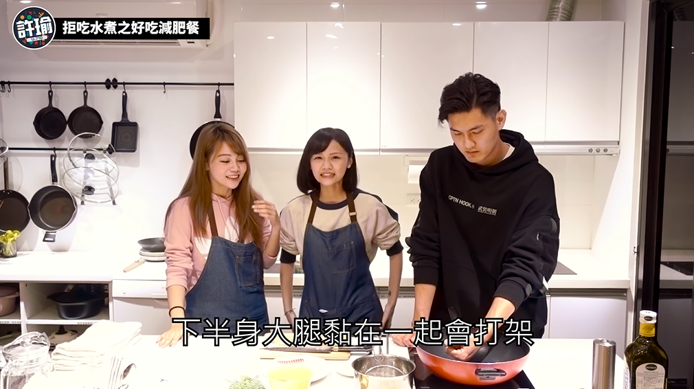 許瑜近日推出「小廚娘」系列影片,在這次的影片中,她找來現任法式廚師Alan和好友卉彤一起製作「好吃減肥餐」,其中包含嫩肩雞胸、特調花椰、鯛魚拌炒蛋等三道料理。不過有趣的是,因為掌廚的人主要是Alan,許瑜也搞笑自嘲自己跟卉彤就是兩個花瓶!後來Alan在過的過程中,許瑜也和卉彤在一旁聊天,其中她還說道兩人都是「很容易胖的人」。