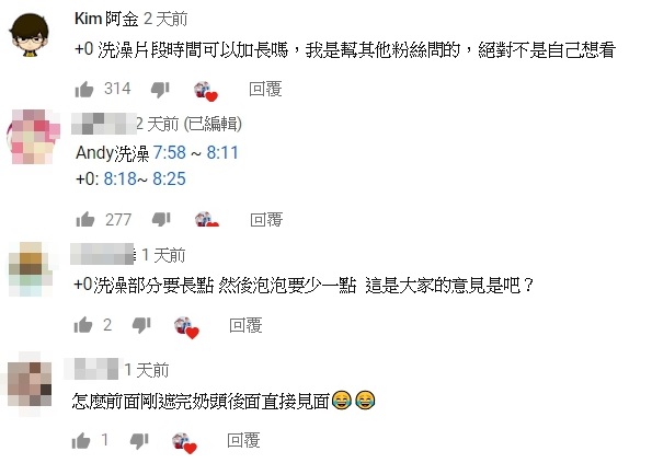 此影片也因為洗澡畫面,引起許多網友回覆;有網友還貼心貼出洗澡的時間碼:「Andy洗澡7:58~8:11 +0:8:18~8:25」、「+0洗澡部分要長點 然後泡泡要少一點 這是大家的意見是吧?」、還有網友笑Andy說:「怎麼前面剛遮完奶頭後面直接見面」,同時也引來同是Youtuber朋友留言:「+0洗澡片段時間可以加長嗎?我是幫其他粉絲問的,絕對不是自己想看」。