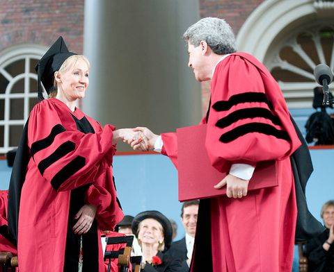 J.K 羅琳曾於2008年受邀到世界頂尖大學「哈佛大學」擔畢典演講者,分享自己在創造出驚點魔法世界前的故事。除此之外哈佛大學也更頒發榮譽學位給她,以示表揚她對年輕世代的影響力!不僅僅是哈佛,還有愛丁堡大學、美國長春藤達特茅斯大學,以及阿伯丁大學等7個榮譽學位。