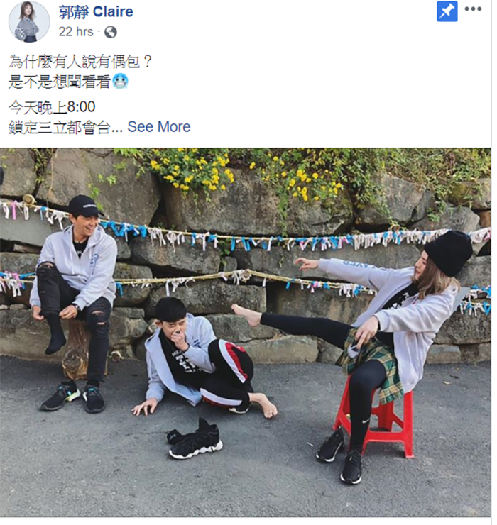 《綜藝玩很大》最新播出的一集來到韓國大邱,其中兩位「稀客」郭靜和敖犬,是8年級最強偶像,來賓陣容讓完粉們看了又驚又喜!不過其中一個關卡要邊爬山邊玩遊戲,由於坡度太陡,郭靜一度無力,最後由小鬼揹著他完成最後一段路,讓不少PPT鄉名狂酸她有偶包,對此,郭靜也在臉書做出回應。