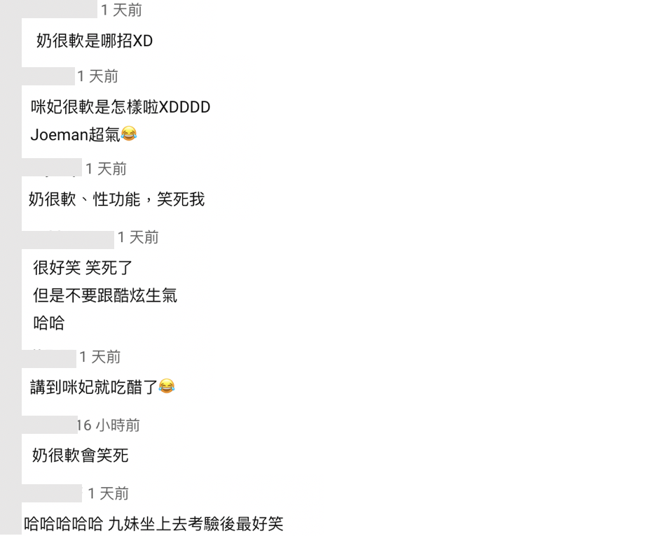 下一題孫生問到「請問咪妃的優點是?」,酷炫毫不猶豫地說出:「奶很軟」,讓其他團員驚訝表示「你摸過喔?」,孫生更搞笑表示:「你沒揪喔」,酷炫也急忙解釋是因為咪妃有拍試穿衣服的影片,感覺身材很好,更表示:「我是不知道要講什麼才亂講的啦」,讓Joeman氣到冒汗。咪妃本人也在下方留言:「酷炫你= =」,看完影片的觀眾也紛紛留言表示:「奶很軟是哪招XD」、「咪妃很軟是怎樣啦XDDDD Joeman超氣」、「奶很軟、性功能,笑死我」、「很好笑 笑死了 但是不要跟酷炫生氣哈哈」、「哈哈哈哈哈 九妹坐上去考驗後最好笑」、「講到咪妃就吃醋了」、「奶很軟會笑死」