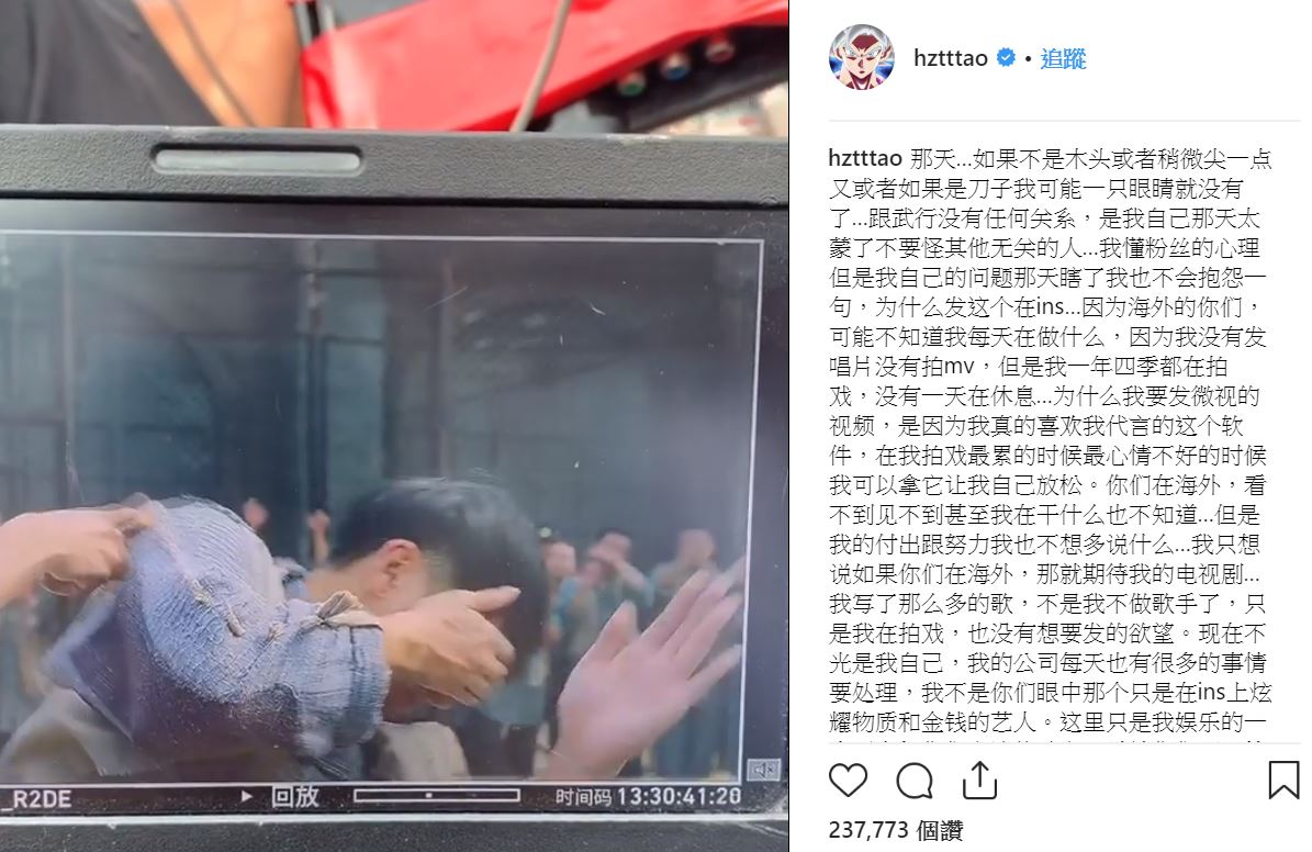 近期積極籌拍電視劇《租界少年之熱血檔案》的黃子韜,2日在Instagram分享武打過程中差點眼睛失明的影片,並在文中解釋「那天…如果不是木頭或者稍微尖一點又或者如果是刀子,我可能一隻眼睛就沒有了」。對此,黃子韜並無責怪對方,反而澄清「是我自己那天太蒙了不要怪其他無關的人」,甚至表示如果真的失明也不會口出怨言,引起粉絲心疼喊話「辛苦了,一直都有關注你的消息」、「照顧好自己」、「小心點」。