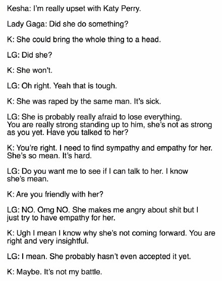 ▼在法院公開的這段訊息之中,凱莎表示自己對於凱蒂佩芮的不願意幫助她指控 Dr. Luke 感到失望,女神卡卡在訊息中為了安慰凱莎直言:「她可能很怕會因此失去一切,妳真的非常努力且堅強站出來對抗了他,她(凱蒂佩芮)還沒有像妳如此強大」、「妳會希望我幫妳去跟她(凱蒂佩芮)談談嗎?我知道她很 mean」,女神卡卡被凱莎問到是否與凱蒂佩芮很要好時,她則否認:「不!我的天,不!那些破事讓我對她感到憤怒不已,但我只想試著對她有同理心一點」。