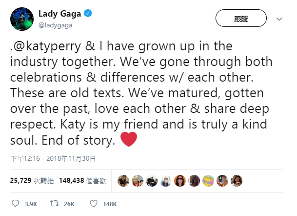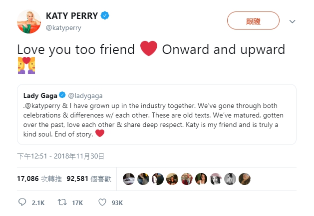 隨後凱蒂佩芮也轉發了女神卡卡這則訊息,並表示同意:「我也愛妳我的朋友 ,一起變得更好。」事實上在 2016 年美國總統大選中,女神卡卡和凱蒂佩芮共同支持的候選人希拉蕊敗選之後,這兩位天后還被捕捉到一起交談選舉和政治意見的親密模樣,或許當時她們就已經談論過凱莎這個事件並已和解。