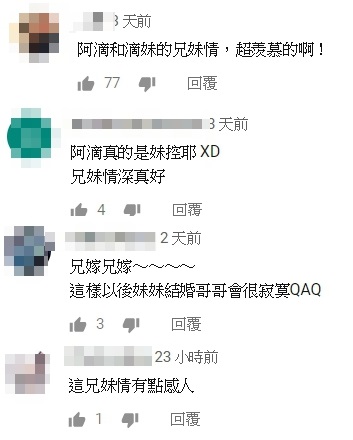 事後節目內容傳至網路上時,許多網友也被感動地說:「阿滴和滴妹的兄妹情,超羨慕的啊!」、「阿滴真的是妹控耶XD兄妹情深真好」、「兄嫁兄嫁~~~這樣以後妹妹結婚哥哥會很寂寞QAQ」、「這兄妹情有點感人」。