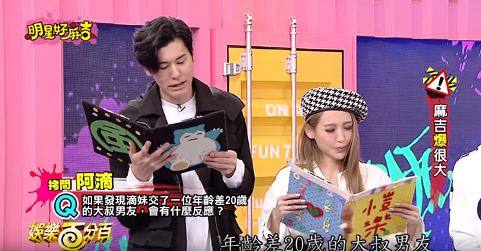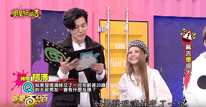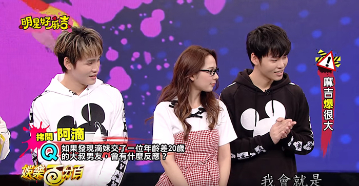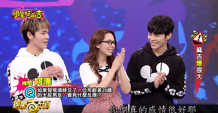 上禮拜四11/29,娛樂百分百所播出的內容,邀請嘉賓們皆是現今台灣最紅youtuber:阿滴、滴妹、展榮、展瑞,兩組嘉賓不僅表演才藝現場Live,更是互玩遊戲,嗨爆笑翻全場,尤其是最後的爆料問答中,哥哥「阿滴」對妹妹「滴妹」的愛更是真情流露,感動全場,更是差點惹哭滴妹,原來是主持人問到一則問題:「如果發現滴妹交了一位年齡差20歲的大叔男友,會有什麼反應?」