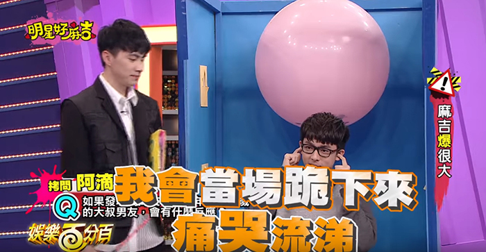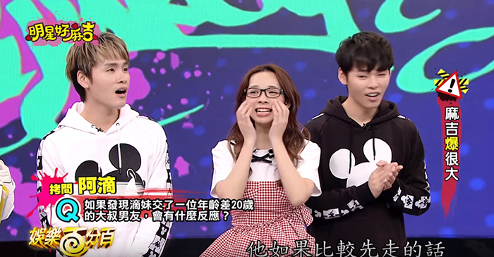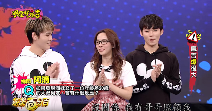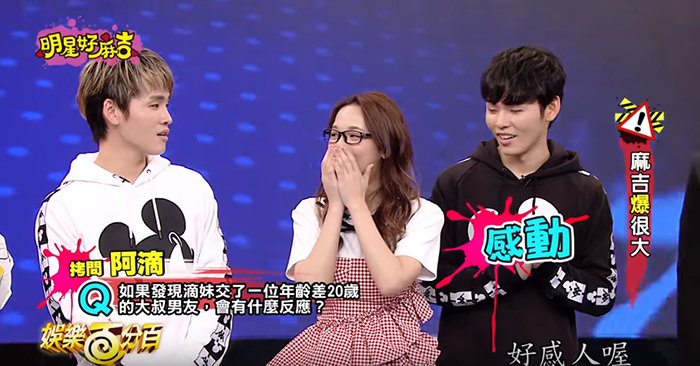 阿滴原本開心的臉,聽完問題立刻就變得異常認真,並回答:「我會就是,我會當場跪下來,痛哭流涕。我覺得不太能接受耶!因為男生這麼大的話,如果老了要怎麼照顧她,他如果比較先走的話。」,此話一出,馬上展現哥哥對妹妹的愛與照顧是隨時隨地,都在為妹妹著想的。