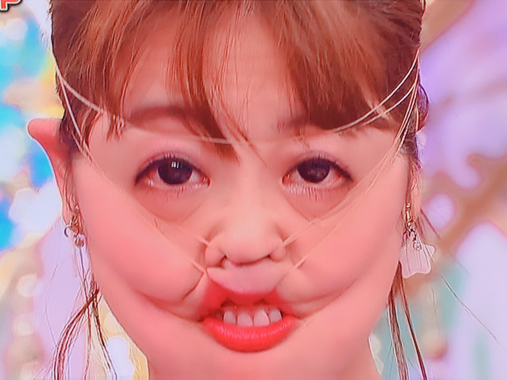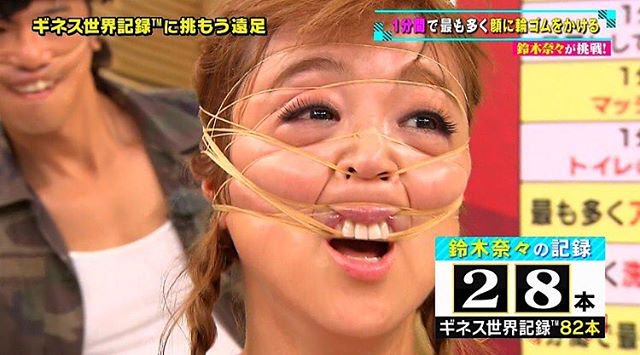 原以為應該差不多到極限了,但鈴木奈奈本人似乎沒什麼感覺,還笑的出來向主持人狂點頭,主持人還順勢要她把下巴部分再加上橡皮筋,鈴木奈奈也照做,這時一旁的來賓受不住大喊拜託停止吧,但是鈴木奈奈繼續加上橡皮筋,此時的她根本就已經不是鈴木奈奈,而是橡皮筋魔人,不知情的觀眾們看到還可能以為是一種新的謎樣生物也說不定。