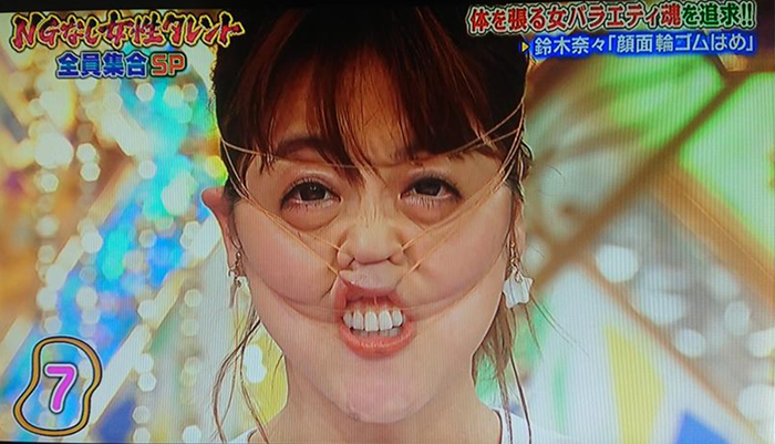 鈴木奈奈剛開始挑戰時,光是一兩條橡皮筋就讓主持人笑得哈哈大笑拍手叫好,而鈴木奈奈還露出微笑繼續把橡皮筋往臉上套,這時來到了第四五條橡皮筋時,一旁作為來賓的女星已經看不下去覺得實在太慘,但另一方面主持人小淳已經笑到倒在地上,此時鈴木奈奈的臉部表情就已非常慘烈,右眼無法睜開,嘴唇被橡皮筋拉住露出一排牙齒,畫面實在是怵目驚心。