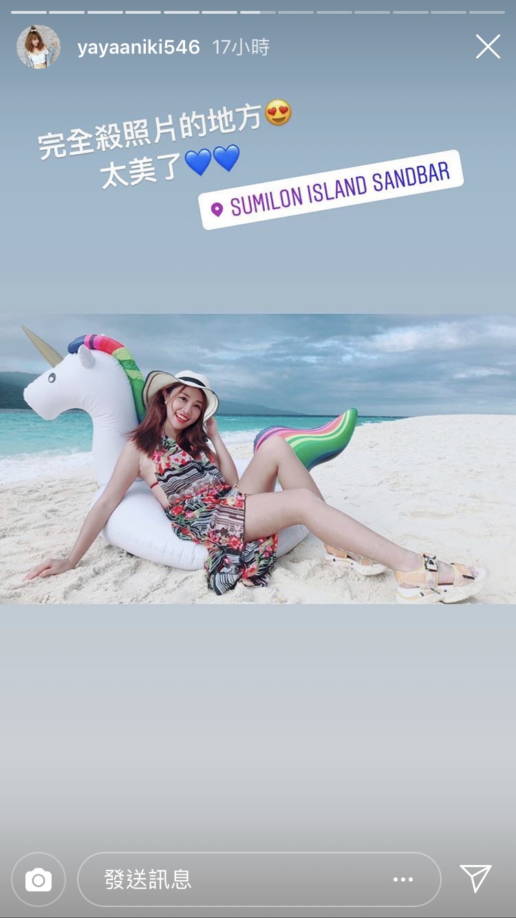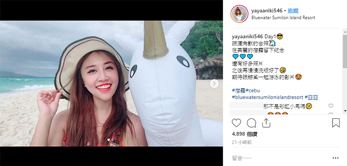 而亞亞也發文打上:「跟獨角獸的合照,在美麗的宿霧留下紀念,還有好多照片,之後再慢慢洗版好了,期待跟鯨鯊一起游泳的影片」,不過可以發現亞亞這次所放的照片就比較保守,反而都將性感照發在限時動態中!