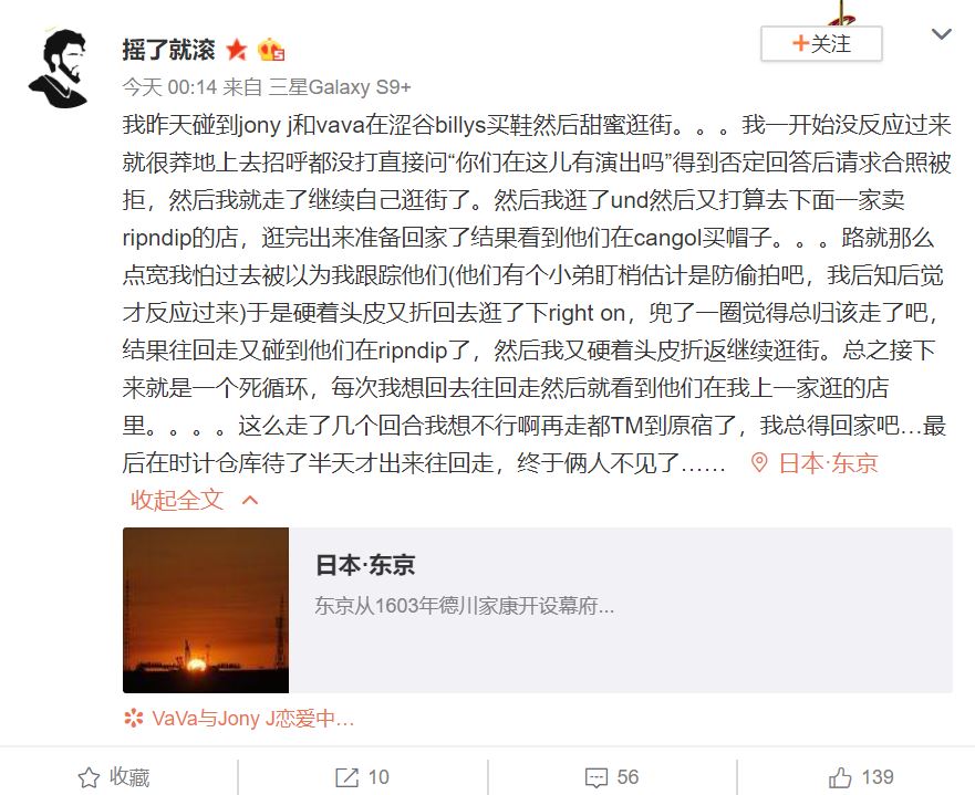 3日,多名網友在微博上發文,表示親眼看到VAVA和Jony J在日本東京街頭並肩甚至手牽手逛街買東西,疑似已經熱戀中,更附上兩人出遊照。根據消息指出,Jony J和VAVA兩人日前現身東京澀谷街頭,還逛了不少潮牌店,撞見要求合照的粉絲,兩人都異口同聲拒絕合照,兩人緋聞一時之間甚囂塵上。