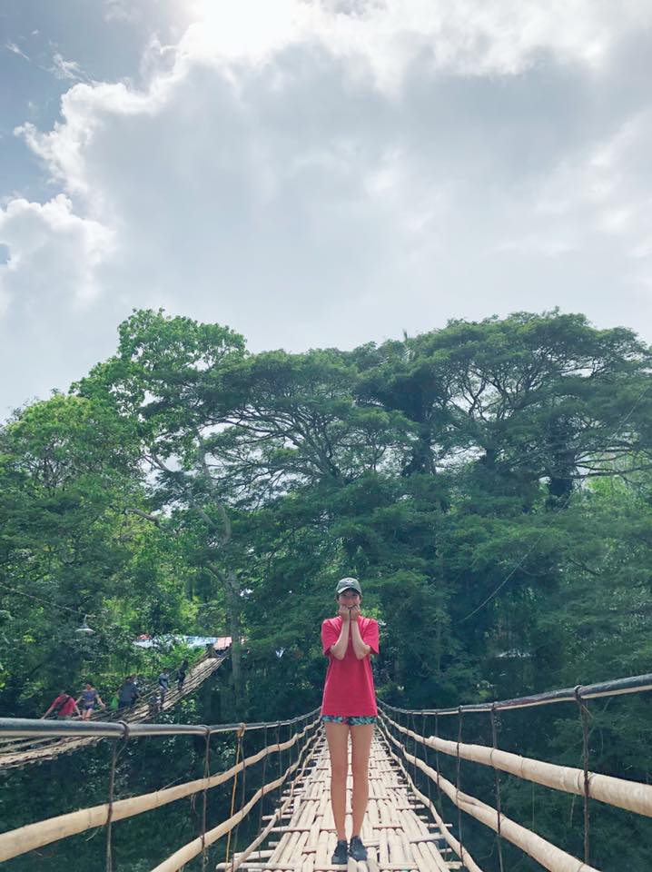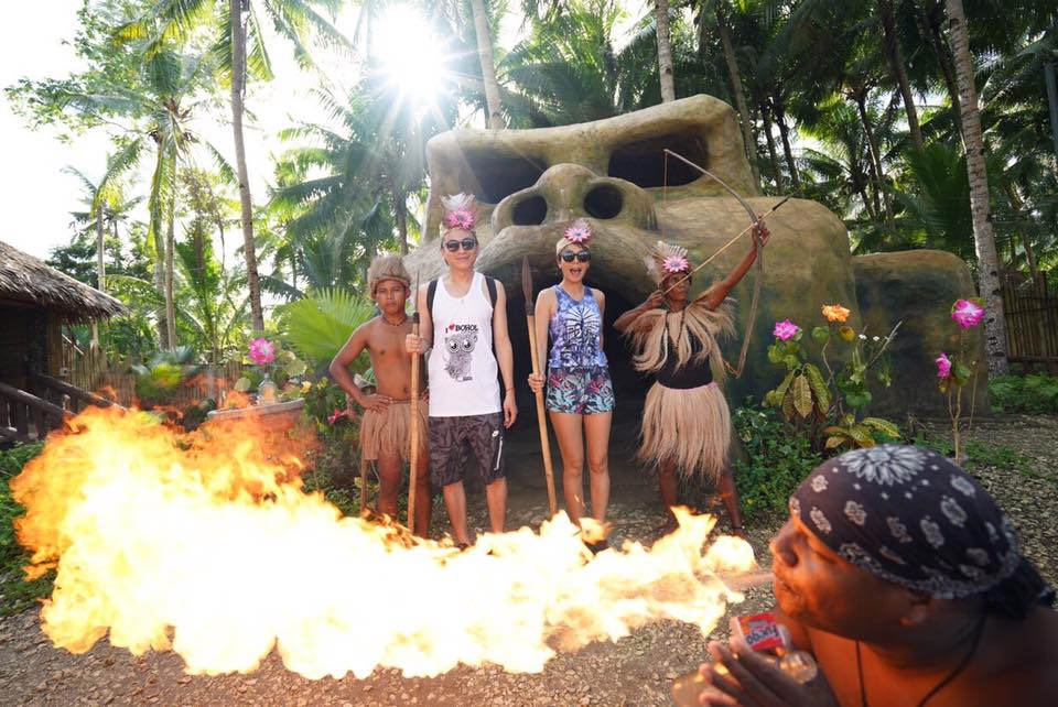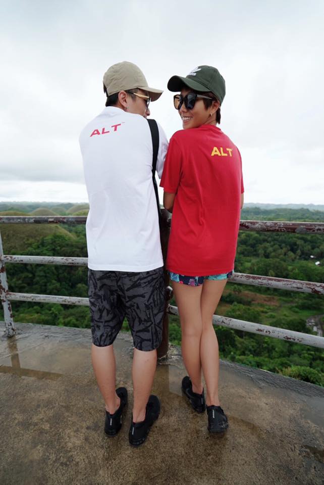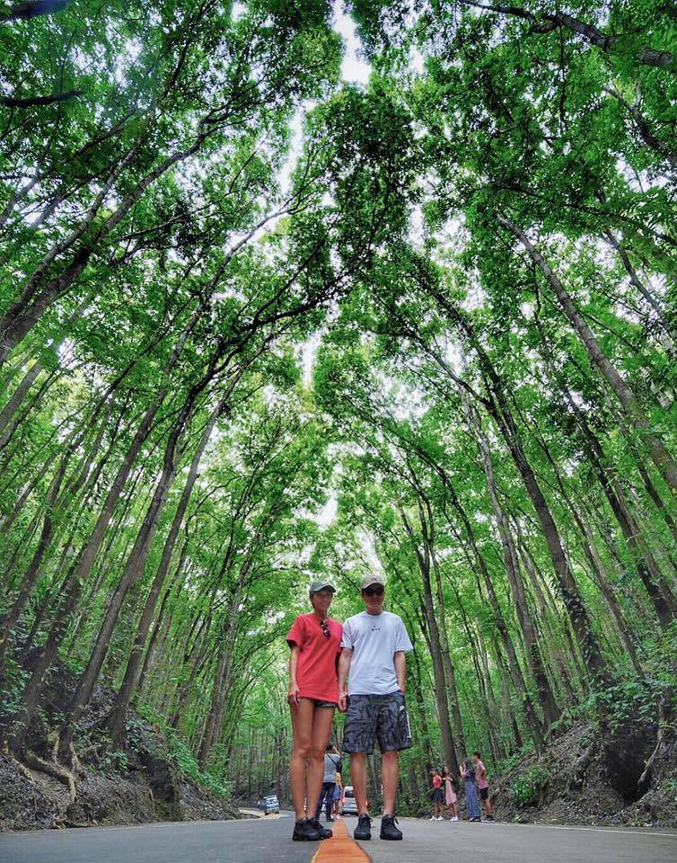 不僅如此,大牙還曬出兩人穿情侶裝的照片,大牙頭戴軍綠色棒球帽,身穿著紅色上衣,下半身搭配一條花花熱褲,而男友也穿著同款上衣。兩人甜蜜的勾著守在樹林間的走道拍照,還有和當地居民的合照,留下許多有趣的紀念。