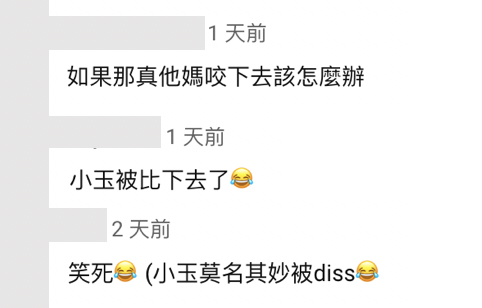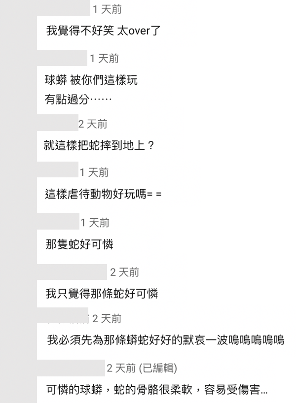 許多網友看完影片紛紛留言表示:「如果那真他媽咬下去該怎麼辦」、「小玉被比下去了」、「笑死(小玉莫名其妙被diss」,也有許多網友非常同情蟒蛇,認為他們這樣玩蟒蛇是不好的行為,表示:「我覺得不好笑 太over了」、「球蟒 被你們這樣玩 有點過分……」、「這樣虐待動物好玩嗎= =」、「那隻蛇好可憐」、「就這樣把蛇摔到地上?」、「可憐的球蟒,蛇的骨骼很柔軟,容易受傷害…」、「我必須先為那條蟒蛇好好的默哀一波嗚嗚嗚嗚嗚」