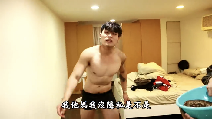 當華晨灰走入浴室開始洗澡時,Nick就不時的催促他洗快一點,當他要拿浴巾時發現臉盆內有一隻大蟒蛇,嚇得後退了好幾步,全裸的奪門而出,憤怒的不斷罵髒話並說道:「你現在是在拍什麼的,我他x我沒隱私是不是」,並將Nick趕出房間,Nick在門外繼續激怒華晨灰,認為他不夠勇敢,並說道:「我覺得你在我眼裡就像小玉一樣」,華晨灰憤怒的直接開門向Nick理論。最後華晨灰為了證明自己並不怕蛇,他將手臂伸出去作勢要給蛇咬,並將蛇放入褲襠中,幾秒後他便將褲子脫下來,甩掉巨蟒快速逃離現場。